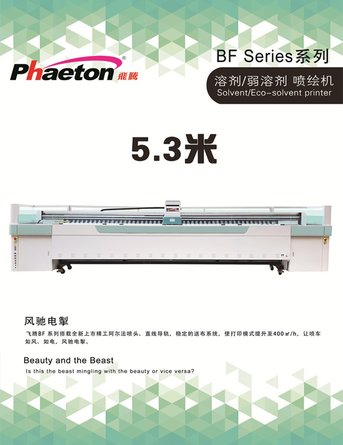 飛騰BF系列搭載全新上市精工阿爾法噴頭、直線導軌,穩定的送布系統,使打印模式提升至400㎡/h,讓噴車如風、如電,風馳電掣。